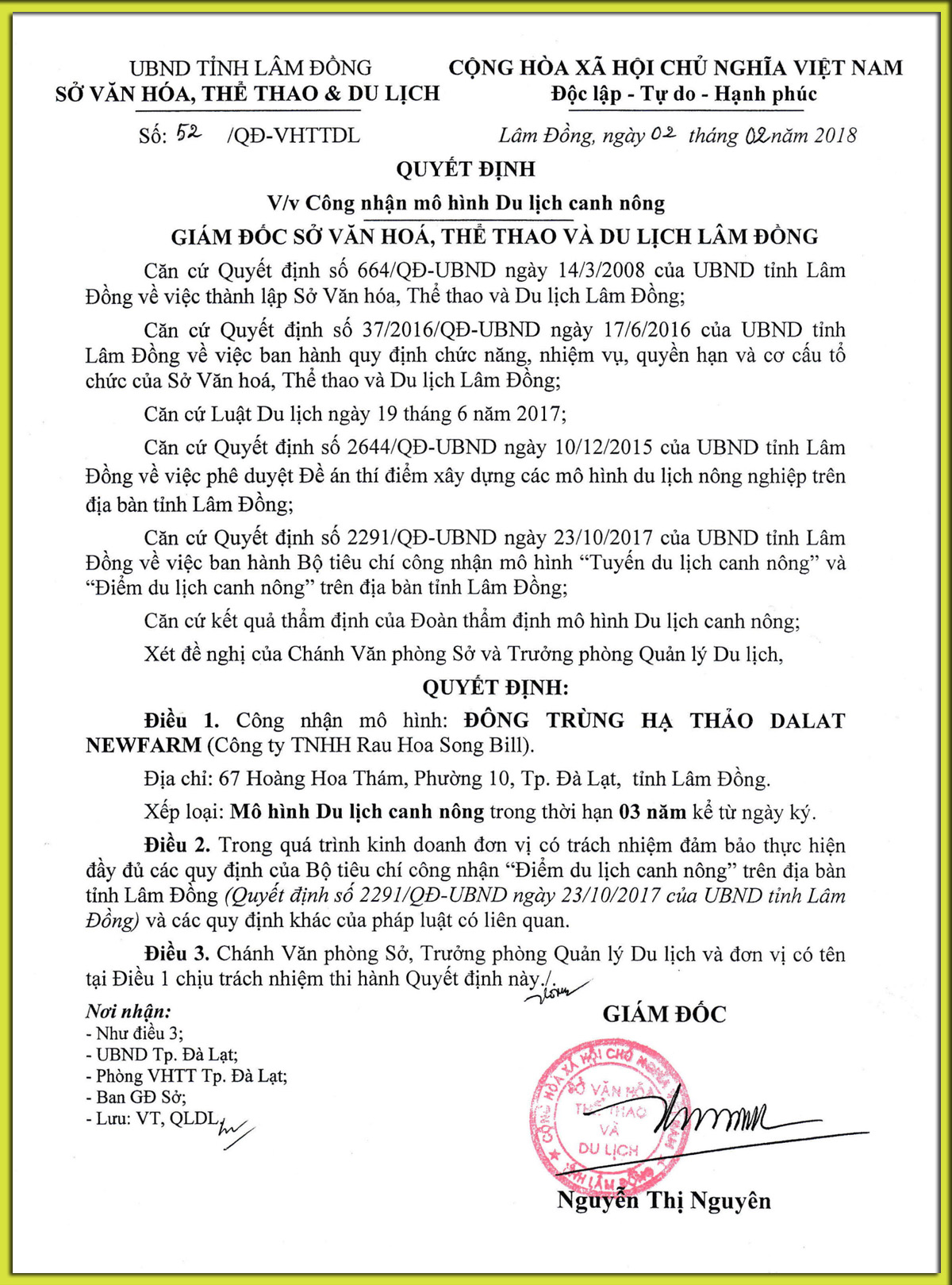 Tham khảo Quyết định số 52/QĐ-VHTTDL ngày 02/02/2018 của Sở Văn Hóa Thể Thao Du Lịch tỉnh Lâm Đồng về việc "Công nhận mô hình Du lịch Canh nông"